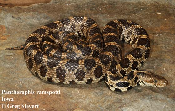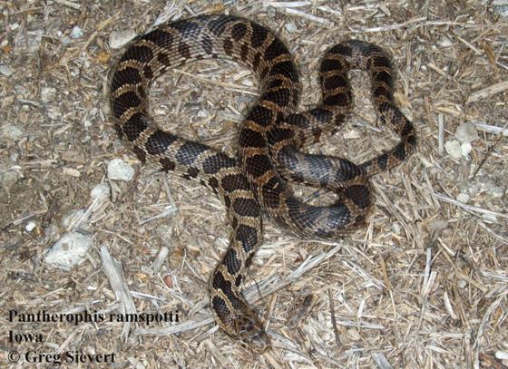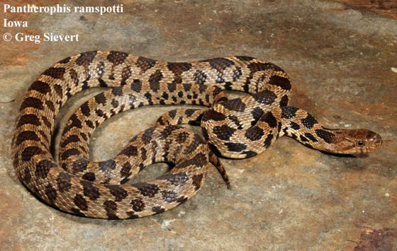 | Diagnosis | Diagnosis: A relatively large Pantherophis, most similar and closely related to P. vulpinus. P. ramspotti differs in blotch count, distribution, and cyt-b nucleotides. P. ramspotti has an average dorsal body blotch count anterior to the cloaca of 42.8 whereas P. vulpinus has an average of 36.8 dorsal body blotches. P. ramspotti is generally distributed west of the Mississippi River and possesses seven unique nucleotides at positions 121 (T), 191 (G), 284 (C), 679 (A), 689 (G), 707 (C), and 830 (C). |