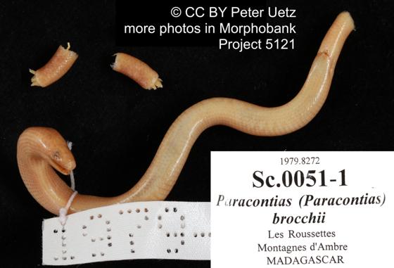 | Comment | Limb morphology: Limbless; Morphology: no ear openings visible. Type Species: Paracontias brocchii MOCQUARD 1894 is the type species of the genus Paracontias MOCQUARD 1894. Phylogenetics of trait evolution in the genus Paracontias: Belluardo et al. 2022. Key: Andreone et al. 2002: 164 provided a key to the species of Paracontias. Reference images: see Uetz et al. 2024 for high-resolution reference images for this species. |
