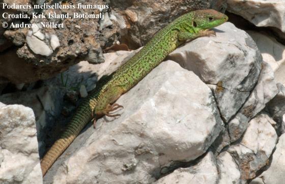 | Synonym | Lacerta melisellensis BRAUN 1877 Lacerta melisellensis — BRAUN 1886 Lacerta serpa var. melisellensis — WERNER 1902: 386 Lacerta serpa var. imitans WERNER 1908: 49 Lacerta serpa var. galvagnii WERNER 1908: 49 Podarcis muralis var. melisellensis — BOULENGER 1920: 187 Lacerta melisellensis galvagnii — MERTENS 1934: 97 Lacerta melisellensis galvagnii — RADOVANOVIC 1956: 11 Podarcis melisellensis — SPEYBROECK et al. 2020 Podarcis melisellensis — PSONIS et al. 2021 Podarcis melisellensis — HENLE 1985 Podarcis melisellensis — ENGELMANN et al 1993 Podarcis melisellensis — POULAKAKIS et al. 2005 Podarcis melisellensis melisellensis — SINDACO & JEREMČENKO 2008 Podarcis melisellensis — KEROGLIDOU et al. 2024 Podarcis melisellensis aeoli (RADOVANOVIC 1959) Lacerta melisellensis aeoli RADOVANOVIC 1959: 412 Podarcis melisellensis bokicae (RADOVANOVIC 1956) Lacerta melisellensis bokicae RADOVANOVIC 1956: 31 Podarcis melisellensis bokicae — TIEDEMANN et al. 1994 Podarcis melisellensis curzolensis (TADDEI 1950) Lacerta melisellensis curzolensis TADDEI 1950: 161 Podarcis melisellensis digenea (WETTSTEIN in KAMMERER 1926) Lacerta fiumana lissana var. digenea WETTSTEIN in KAMMERER 1926 Podarcis melisellensis digenea — TIEDEMANN et al. 1994: 41 Podarcis melisellensis fiumanus (WERNER 1891) Lacerta muralis neapolitana var. olivacea WERNER 1891: 753 Lacerta neapolitana var. striata WERNER 1891: 753 Lacerta muralis var. littoralis WERNER 1897 Lacerta littoralis — WERNER 1902: 384 Lacerta fiumana var. bocchensis SCHREIBER 1912 (fide TIEDEMANN et al. 1994) Lacerta taurica fiumana — WERNER 1920: 23 Podarcis muralis var. fiumana — BOULENGER 1920: 179 Lacerta melisellensis fiumana — KAUFFELD 1931 Lacerta fiumana — RADOVANOVIC 1941: 153 Lacerta melisellensis fiumana — TADDEI 1950: 159 Lacerta fiumana gracilis RADOVANOVIC 1951 Lacerta melisellensis gigantea RADOVANOVIC 1956: 21 Lacerta melisellensis plutonis RADOVANOVIC 1959: 415 Lacerta melisellensis traguriana RADOVANOVIC 1959: 416 (nom. nov.) Lacerta melisellensis traguriana RADOVANOVIC 1970 Lacerta melisellensis lupa RADOVANOVIC 1970: 62 Lacerta melisellensis caprina RADOVANOVIC 1970: 66 Podarcis melisellensis gigantea — TIEDEMANN et al. 1994 Podarcis melisellensis fiumana — SEHNAL & SCHUSTER 1999 Podarcis melisellensis fiumana — MAYER & PODNAR 2002 Podarcis melisellensis fiumanus — SINDACO & JEREMČENKO 2008 Podarcis melisellensis fiumana — DIECKMANN & DIECKMANN 2010 Podarcis melisellensis fiumanus var. fiumana — DIECKMANN 2017 Podarcis melisellensis fiumanus var. olivacea — DIECKMANN 2017 Podarcis melisellensis fiumanus — GEBHART 2020 Podarcis melisellensis fiumanus — SINDACO & RAZZETTI 2021 Podarcis melisellensis fiumanus — SÄMANN et al. 2023 Podarcis melisellensis gigas (WETTSTEIN in KAMMERER 1926) Lacerta fiumana gigas WETTSTEIN in KAMMERER 1926 Lacerta melisellensis gigas RADOVANOVIC 1956: 19 Podarcis melisellensis gigas — TIEDEMANN et al. 1994: 40 Podarcis melisellensis jidulae (RADOVANOVIC 1959) Lacerta melisellensis jidulae RADOVANOVIC 1959: 402 Podarcis melisellensis kammereri (WETTSTEIN in KAMMERER 1926) Lacerta fiumana kammereri WETTSTEIN in KAMMERER 1926 Lacerta melisellensis kammereri — RADOVANOVIC 1956: 13 Podarcis melisellensis kammereri — TIEDEMANN et al. 1994: 40 Podarcis melisellensis kornatica (RADOVANOVIC 1959) Lacerta melisellensis kornatica RADOVANOVIC 1959: 405 Podarcis melisellensis lissana (WERNER, 1891) Lacerta muralis fusca var. lissana WERNER 1891: 752 Podarcis muralis var. lissana — BOULENGER 1920: 185 Lacerta melisellensis lissana — RADOVANOVIC 1956: 14 Podarcis melisellensis lissana — TIEDEMANN et al. 1994: 43 Podarcis melisellensis mikavicae (RADOVANOVIC 1959) Lacerta melisellensis mikavicae RADOVANOVIC 1959: 414 Podarcis melisellensis pomoensis (WETTSTEIN in KAMMERER 1926) Lacerta fiumana pomoensis WETTSTEIN in KAMMERER 1926 Lacerta melisellensis pomoënsis — RADOVANOVIC 1956: 11 Podarcis melisellensis pomoensis — TIEDEMANN et al. 1994: 41 Podarcis melisellensis thetidis (RADOVANOVIC 1959) Lacerta melisellensis thetidis RADOVANOVIC 1959: 414 |